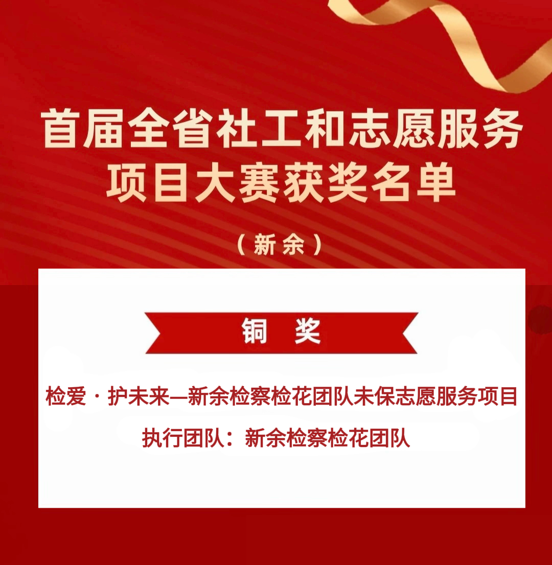 12月4日,在第40个国际志愿者日来临之际,江西省首届社会工作与志愿服务项目大赛决赛暨优秀项目展示交流在南昌圆满落幕。新余市检察院“检爱·护未来——新余检察检花团队未成年人保护志愿服务项目”荣获铜奖。