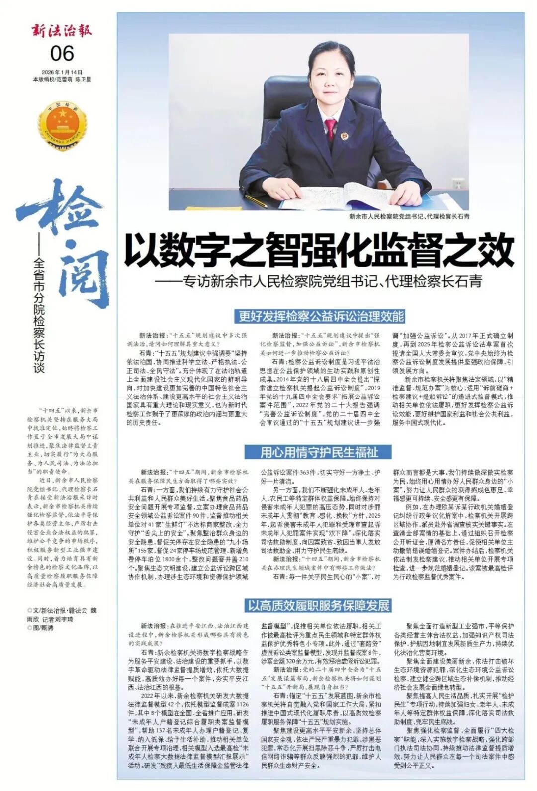 近日,新余市人民检察院党组书记、代理检察长石青在接受新法治报采访时表示,新余市检察机关持续强化检察监督,依法平等保护各类经营主体,严厉打击侵害企业合法权益的犯罪,维护公平竞争的市场秩序,积极服务新型工业强市建设。同时,着力培育具有新余特色的检察文化品牌,以高质量检察履职服务保障经济社会高质量发展。